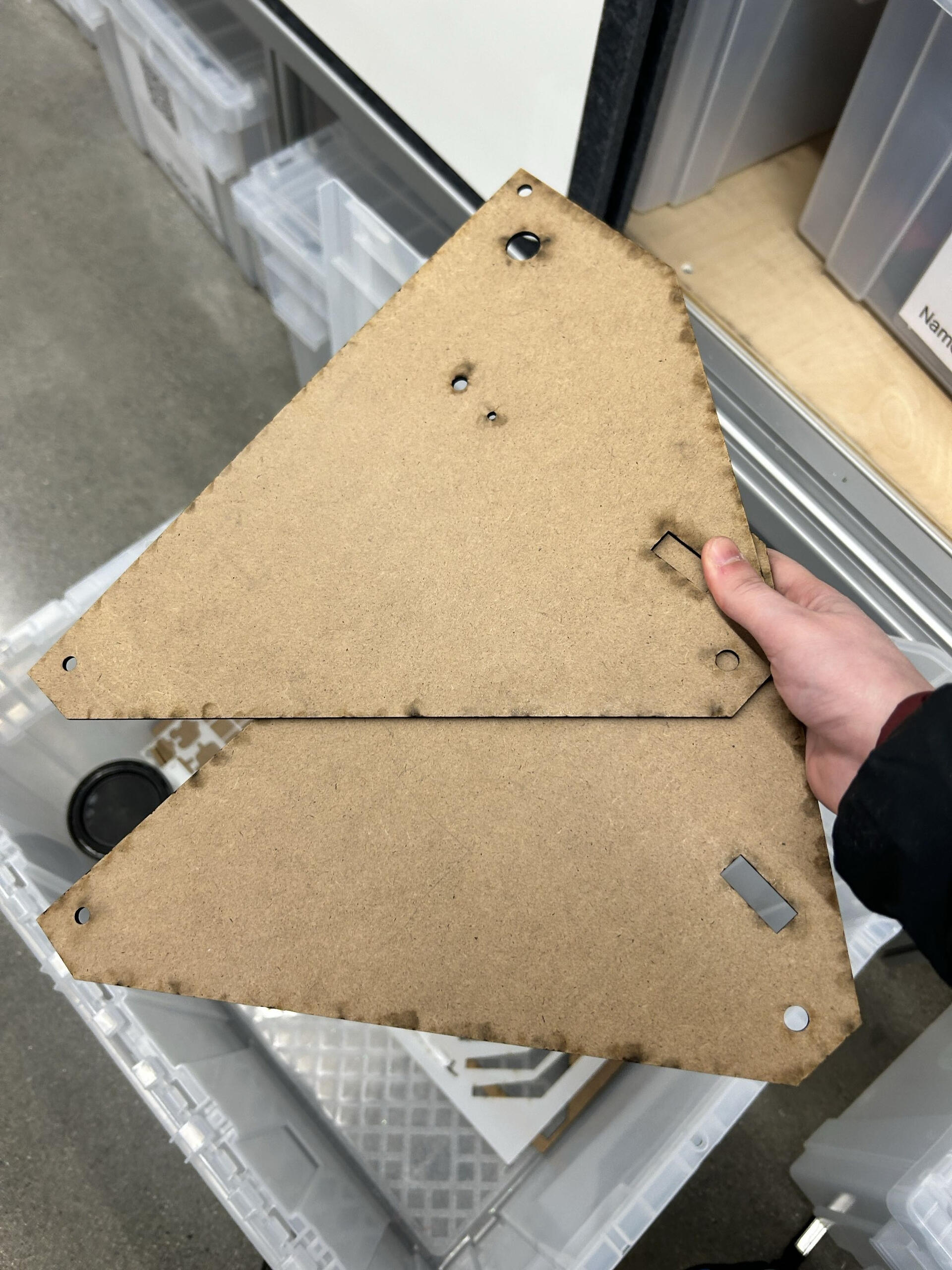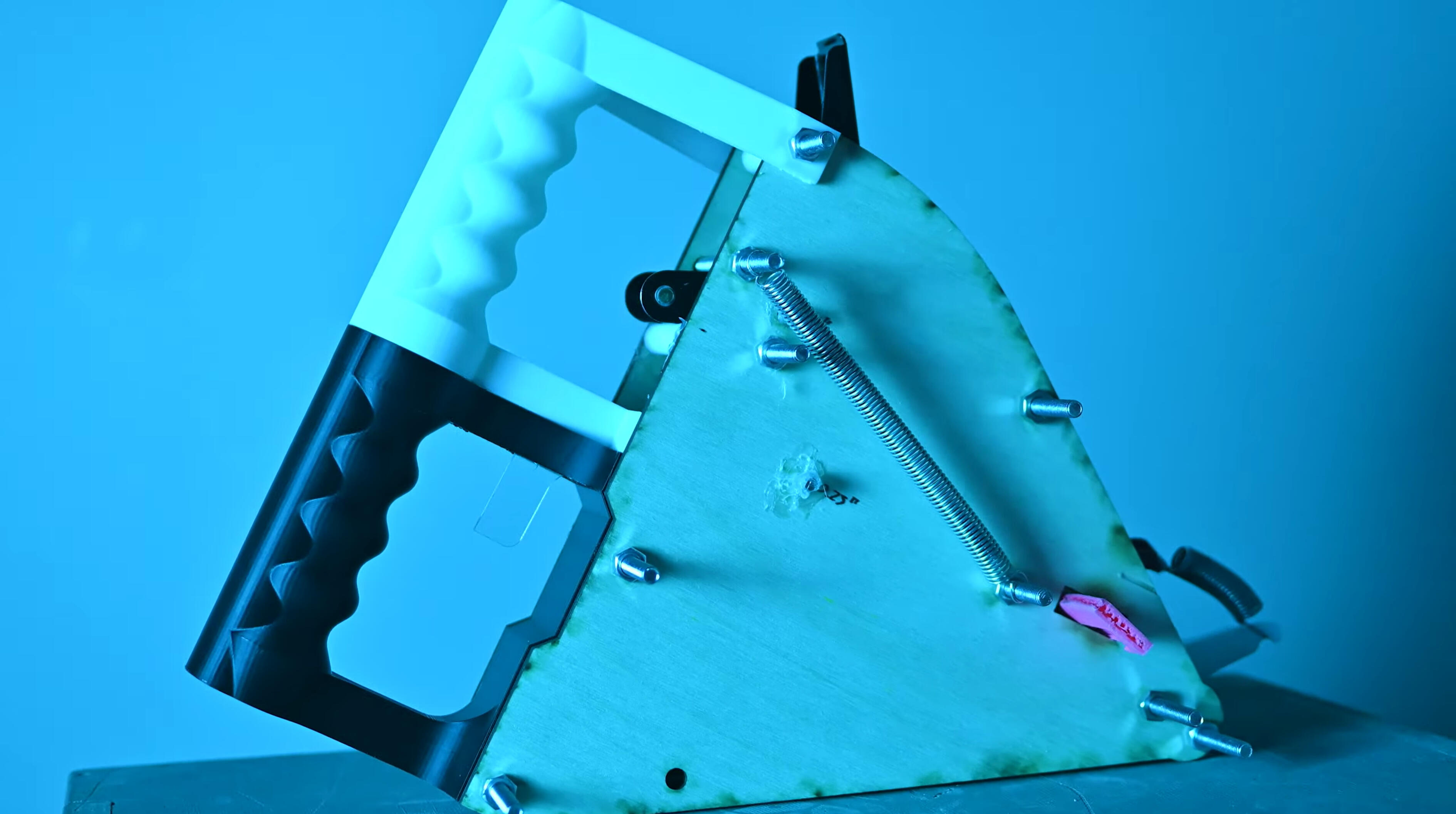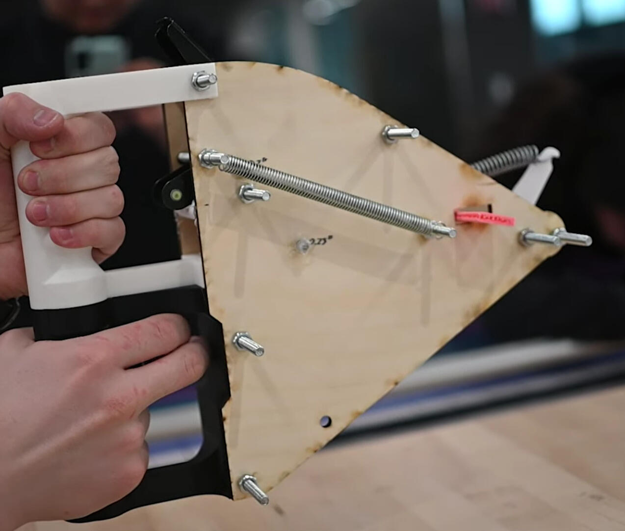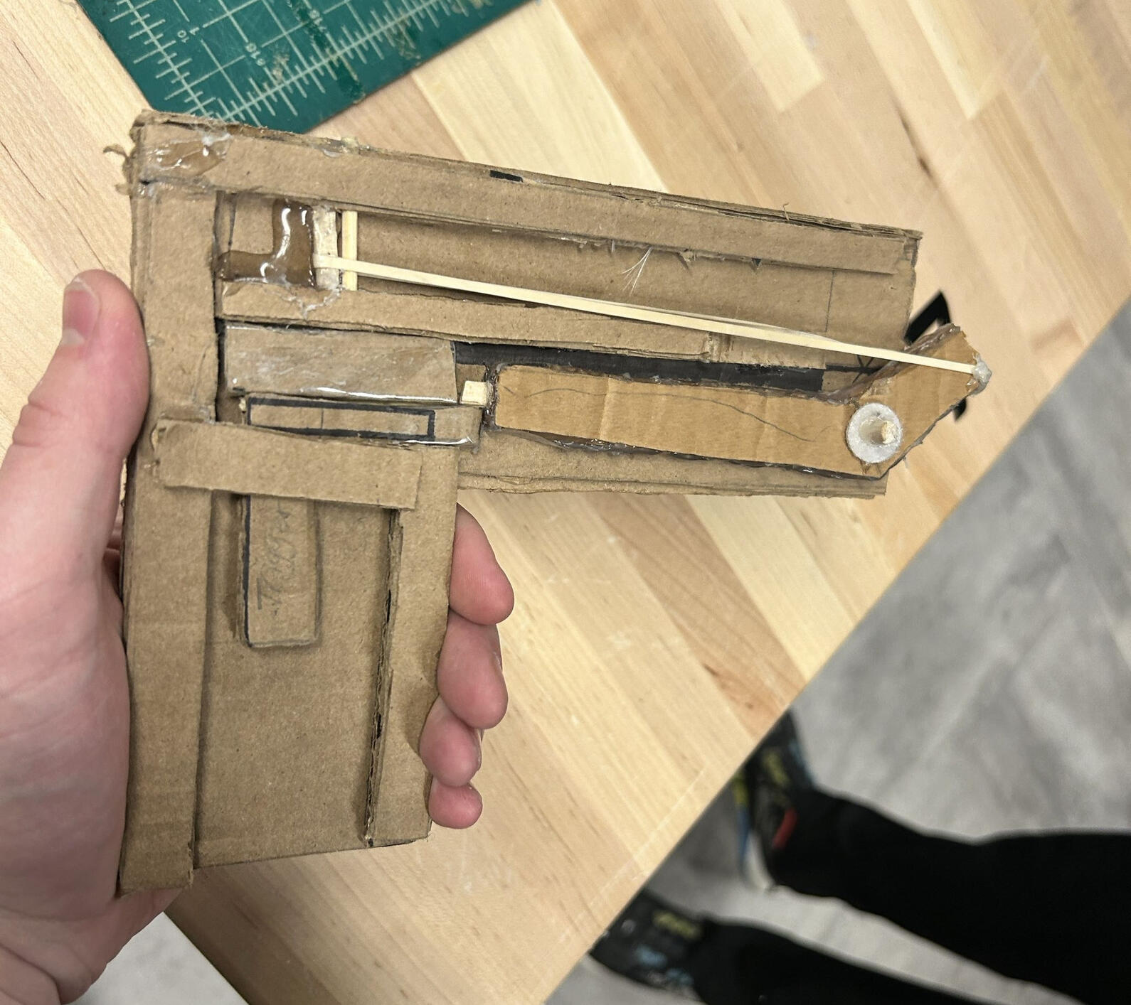 The design phase of this project took shape through a collaborative and iterative design process. Throughout the prototyping phase, however, my job was task distribution and some manufacturing and CAD. Our initial prototype was a quick cardboard model, and relatively weapon shaped, which we decided to change upon feedback from our class and professor. Our second prototype was much more triangular, with an aim to have handles above and below the mechanism. It was modeled in Onshape before being laser-cut. The trigger and arm were laser-cut acrylic, while the side panels were cut out of MDF.