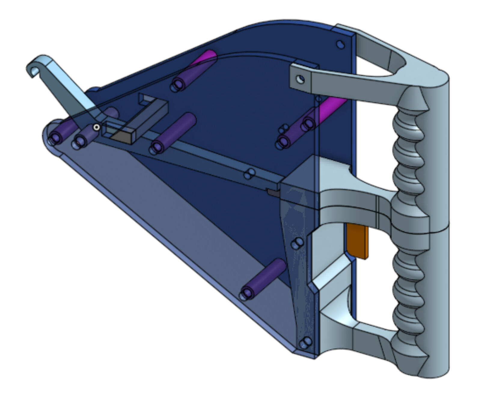 Unfortunately, after our initial test, the acrylic arm snapped, likely due to its poor impact strength at our speed. Additionally, the triangular models were quite bulky, thus I refined it into a much more rounded and ergonomic shape, while remaking the trigger out of a polyeurathane cutting board. The handles were also reprinted to fit the new side panels, and this time featured grips. I planned out how all the components would fit together, as well as the designs of the handles, arm, trigger, and side panels in Onshape. This allowed for easy collaboration and sharing of ideas and files.