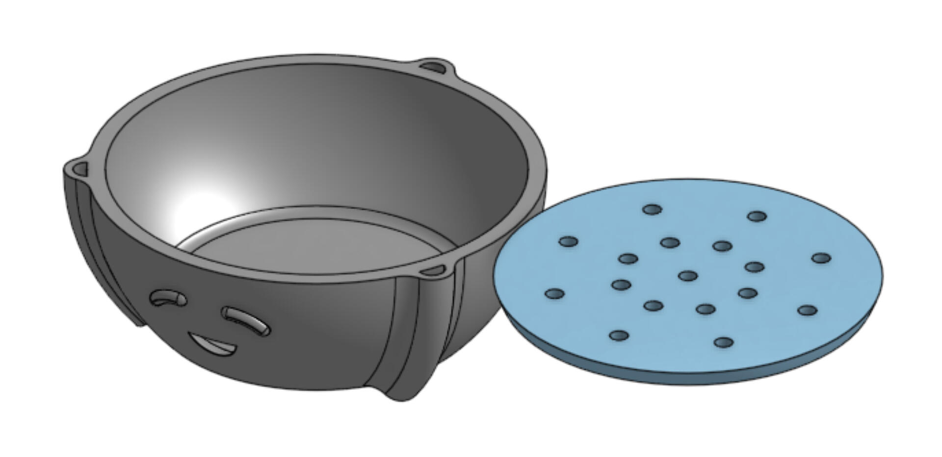 There are various ways to get water to drain out of a planter, but it is important that the rope which the planter hangs from doesn't block the access to the water. My initial idea was to utilize a mouth-like hole underneath a grate near the bottom of the planter, so the planter could be split into two sections: one for the plant and dirt, and the other for the water drainage. The water could pass through the grate, but the large pieces of gravel at the bottom of the dirt couldn't, and the gravel would hold the dirt above it and prevent it from washing through the grate.