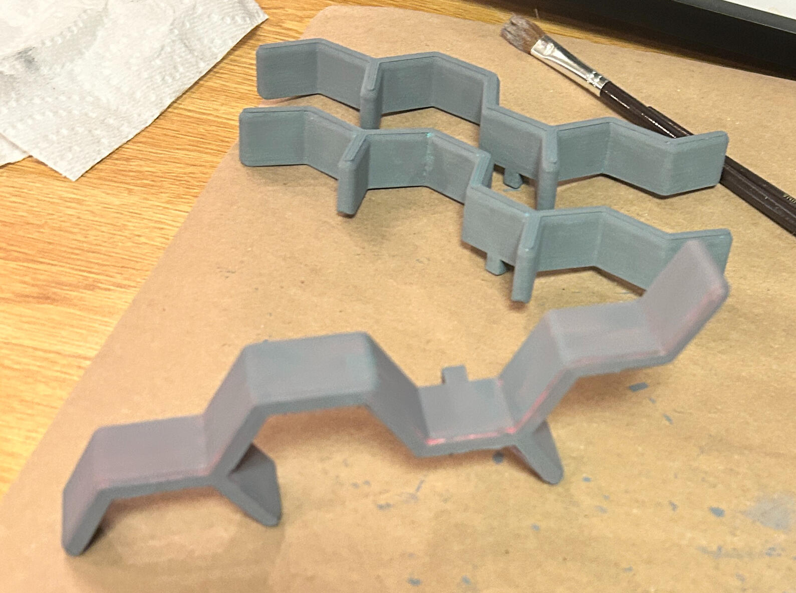 Once the design was finalized, I had to make sure that the pegs for each wall fit the holes in the board. I did some research for tolerances in 3D printing and compared them to the tolerances used in laser cutting, and discovered that roughly a 0.02 in tolerance should work for our purposes.I 3D-printed the walls, sanding and painting them as I went, first with two layers of grey and then with two layers of silver.
