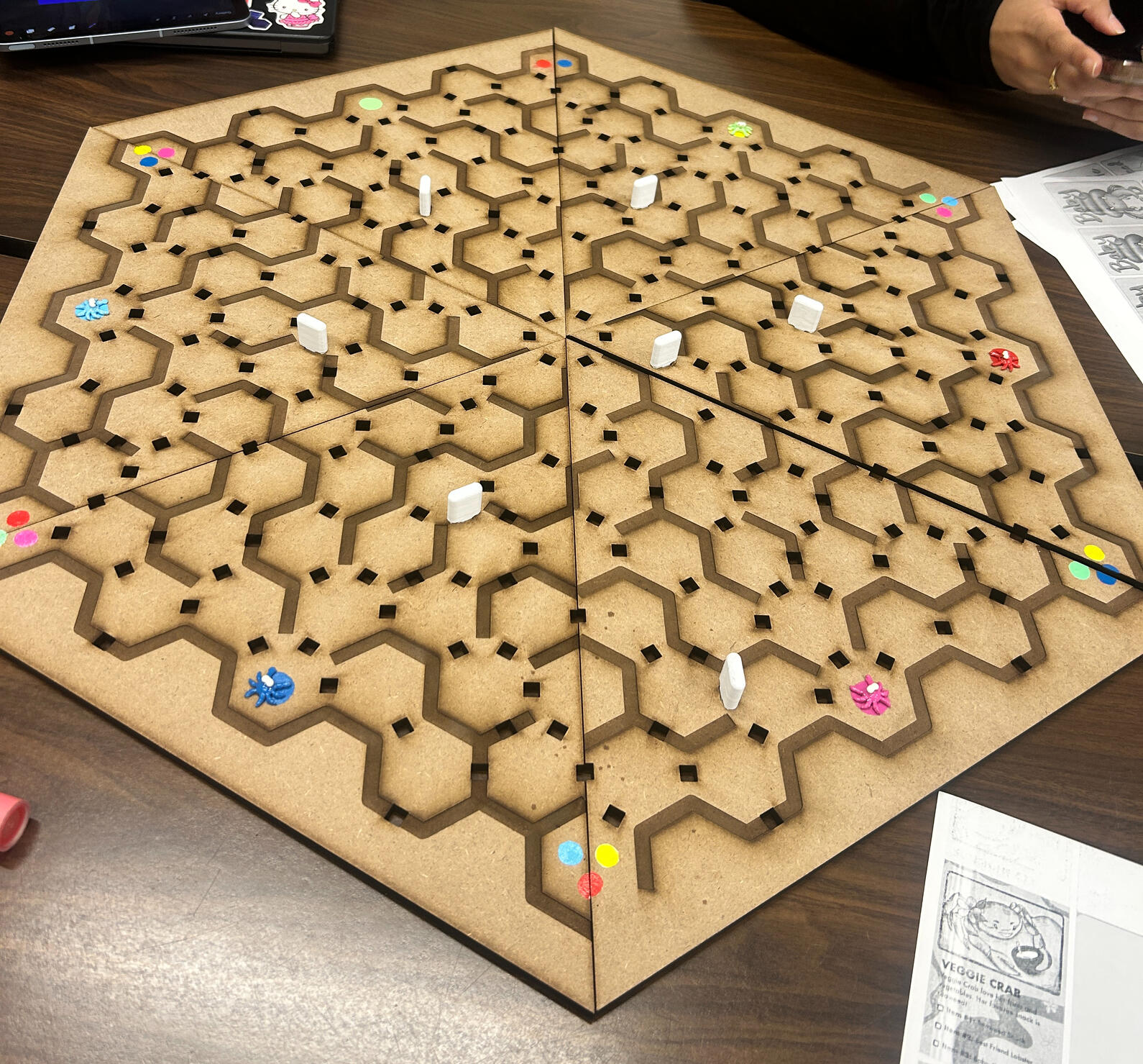 Then, I laser cut the board out of MDF, and slowly watched the project come together. While there were a couple errors in the design (a missed hole and a missed engraving to mark where part of a wall would go), those errors didn't impact the performance of the project.Another part I was responsible for was the resin printing of the crab pieces. This part consisted primarily of sourcing the file, confirming its approval with my groupmates, and then getting it printed in the Northeastern CAMD Ryder makerspace.